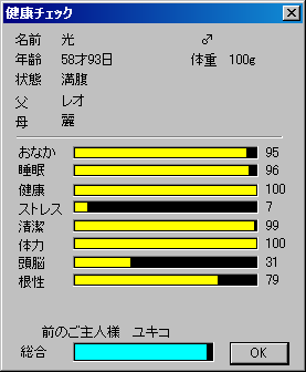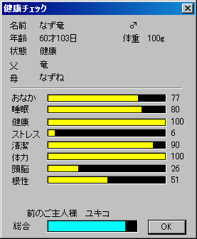 育成中の原人が老人姿に変身しました。 ・・・と、その前に、変身前の結婚をup なず竜くん(47歳)→ まりこさん(48歳)=なずこ(♀) まりこさん(49歳)→ なず竜くん(48歳)=まり竜3(♂) タマゴがかえった音で気づきました(汗 光くん(48歳)→ すずらんさん(51歳)=光ん2(♀) 私はこの元気な老人が好きなのですが、 どのくらいのパラメータだとこうなるのかなーと思って・・・ 今後の参考に、変身時のパラメータを続きにup